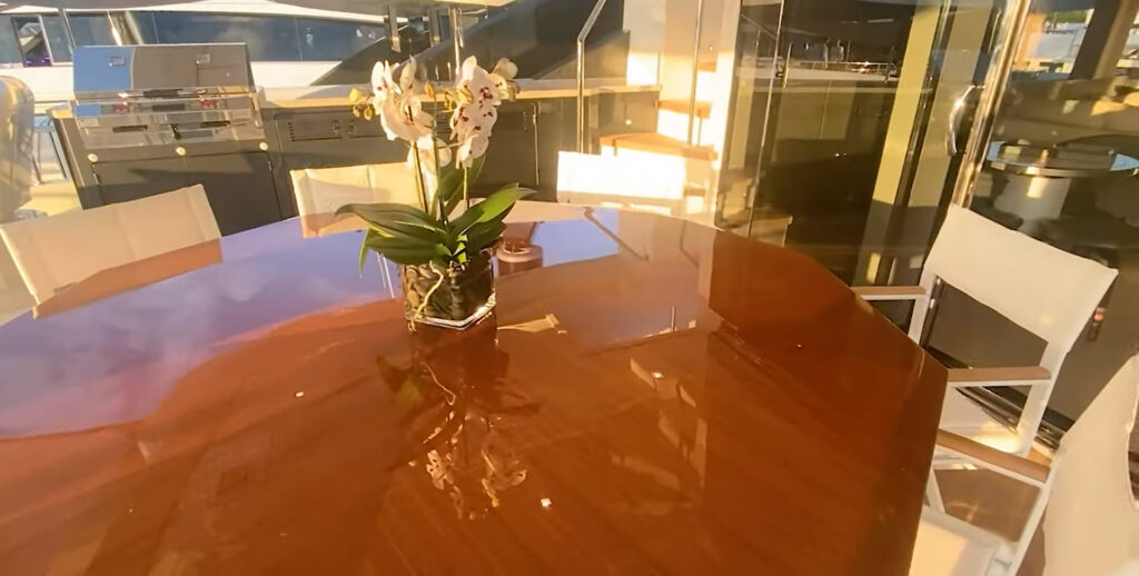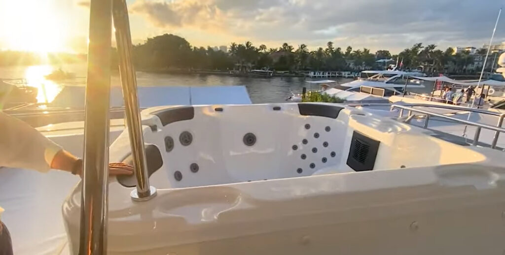 On the sundeck you’ll find the Jacuzzi, wet bar with stools and more sofa seating.