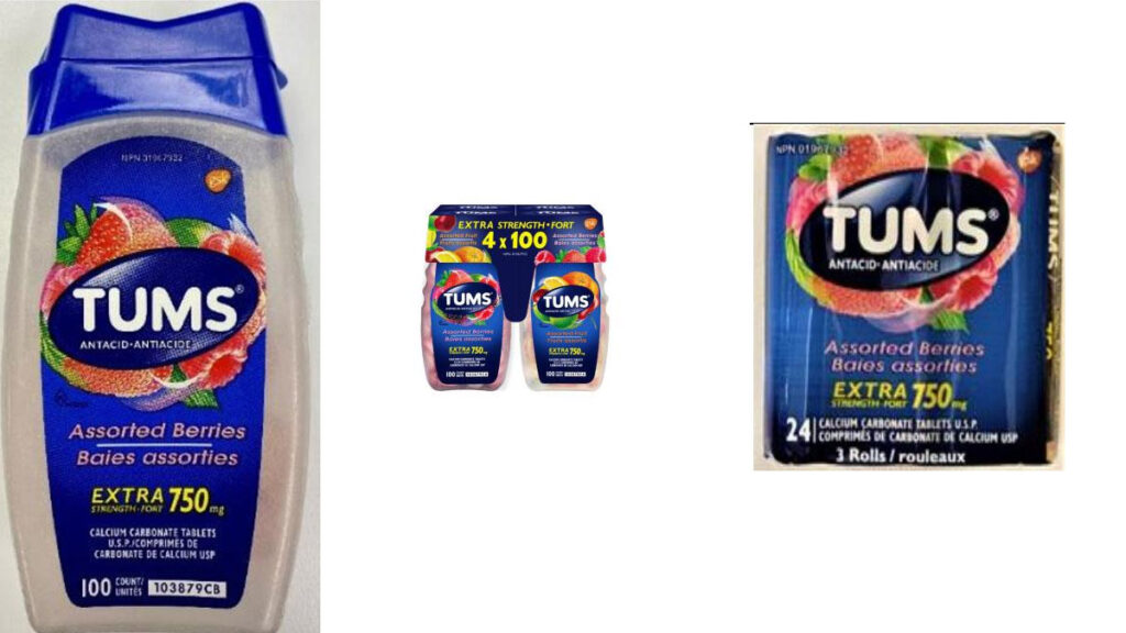 TUMS Assorted Berries Extra Strength Tablets (750 mg bottle of 100 tablets) NPN: 01967932. Lot: 7B3G (sold individually and as part of Costco club packs – see note below). Expiry: August 2025