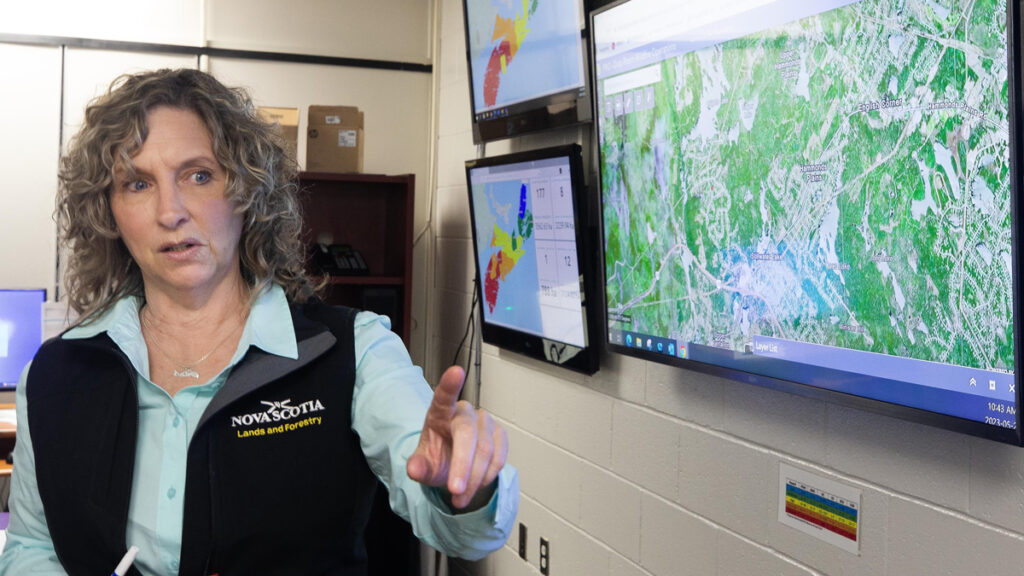 Anne Dillman, Assistant Duty officer at the Fire Control Centre, goes over the logistics of managing two major fires in Nova Scotia – Photo: Communications Nova Scotia
