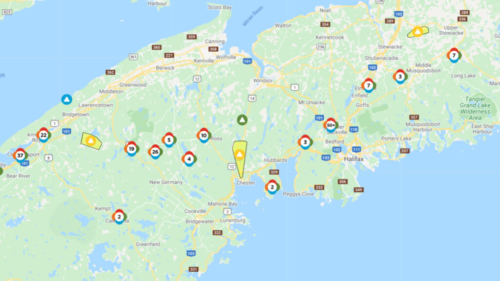As freezing rain moves south, a line of power outages stretching across much of mainland Nova Scotia could move south into Halifax and Dartmouth this evening. (Photo: Google Maps, Nova Scotia Power)