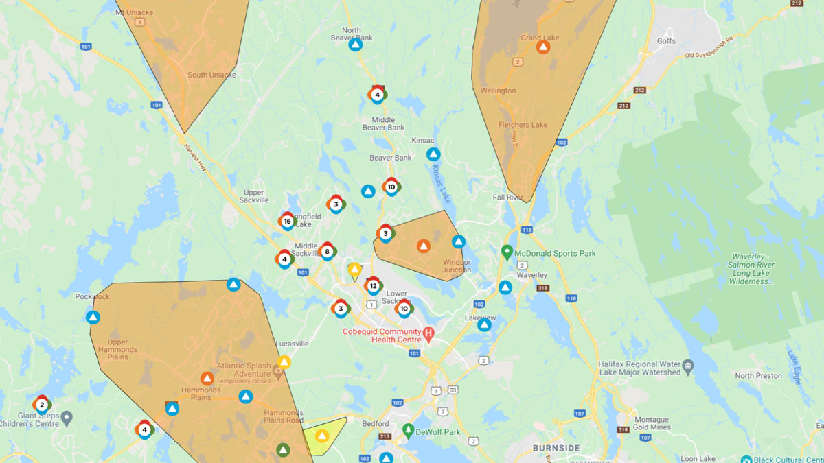 The highest density of those without power is in the Lower Sackville, Middle Sackville, Hammonds Plains and Fall River areas. (Photo: Google Maps, Nova Scotia Power)