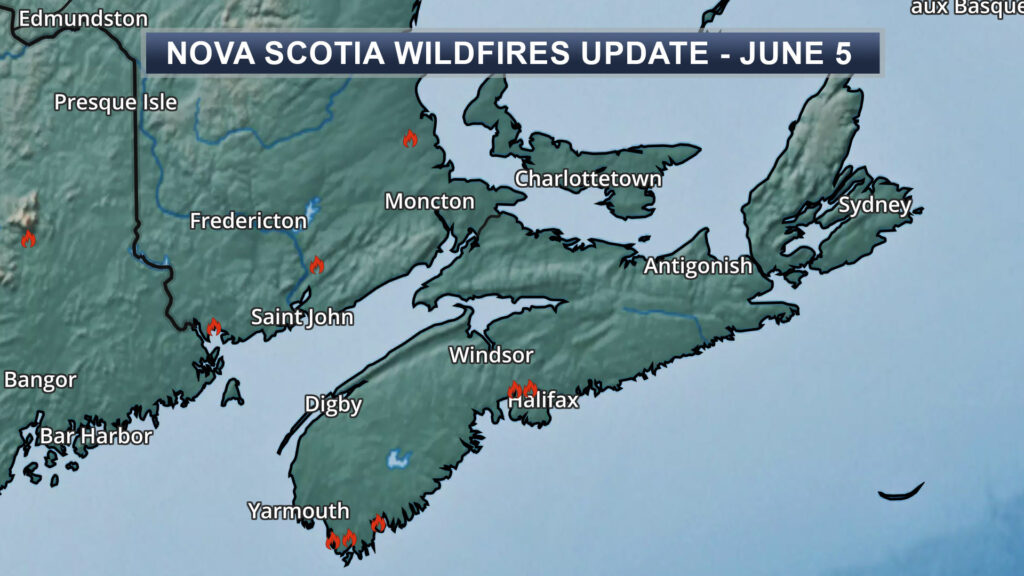 The Barrington Lake wildfire in Shelburne County is still out of control. In total, there are five active wildfires in the province today, June 5: