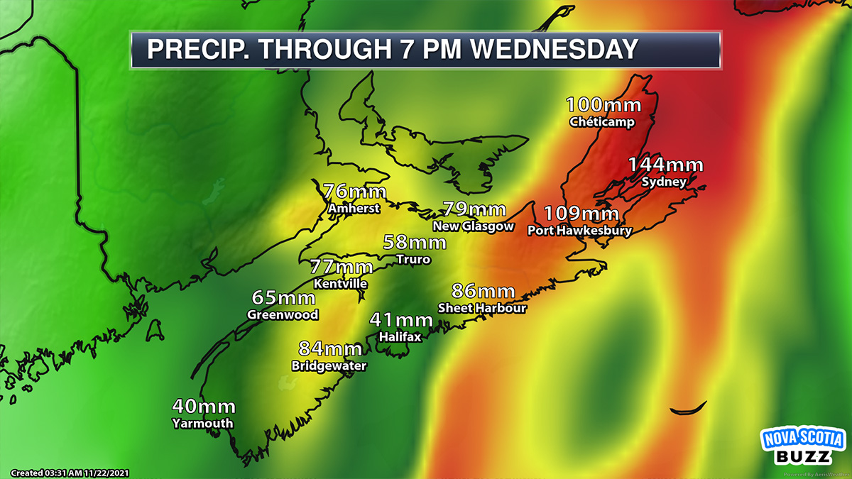 Environment Canada says to expect rain which at times will be heavy. Amounts of 60-90mm are expected across the province, with some areas possible reaching 100-150mm in Eastern Nova Scotia.