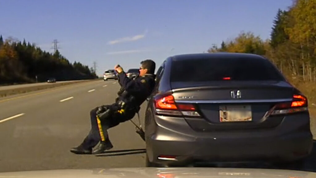 RCMP say on On October 11, at approximately 1:45 PM, an RCMP officer was conducting a roadside stop on a vehicle on a straight stretch of Highway 101 in Upper Sackville. While the officer was out of his vehicle, which had the emergency lights flashing, it was struck by a passing Honda Civic.