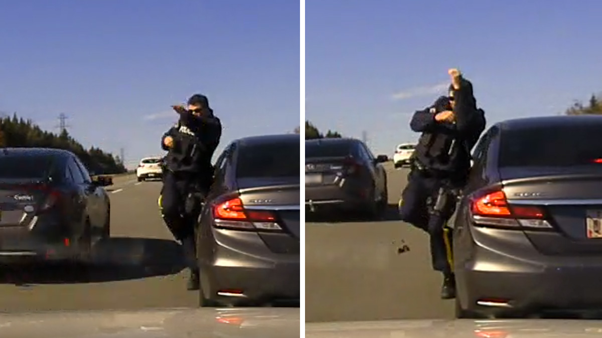 RCMP say on On October 11, at approximately 1:45 PM, an RCMP officer was conducting a roadside stop on a vehicle on a straight stretch of Highway 101 in Upper Sackville. While the officer was out of his vehicle, which had the emergency lights flashing, it was struck by a passing Honda Civic.