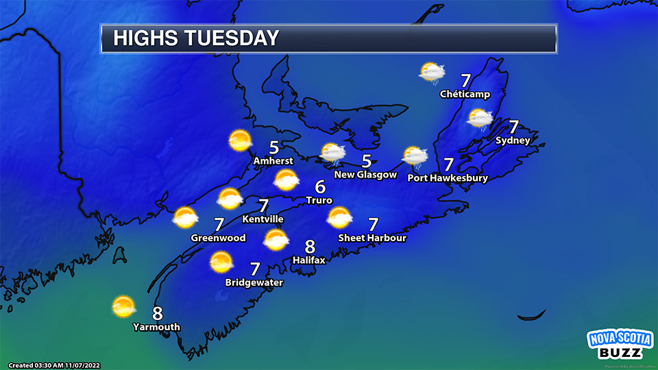 On Tuesday, temperatures are forecast to plummet across Nova Scotia as the first preview of cooler winter weather moves in to the region.