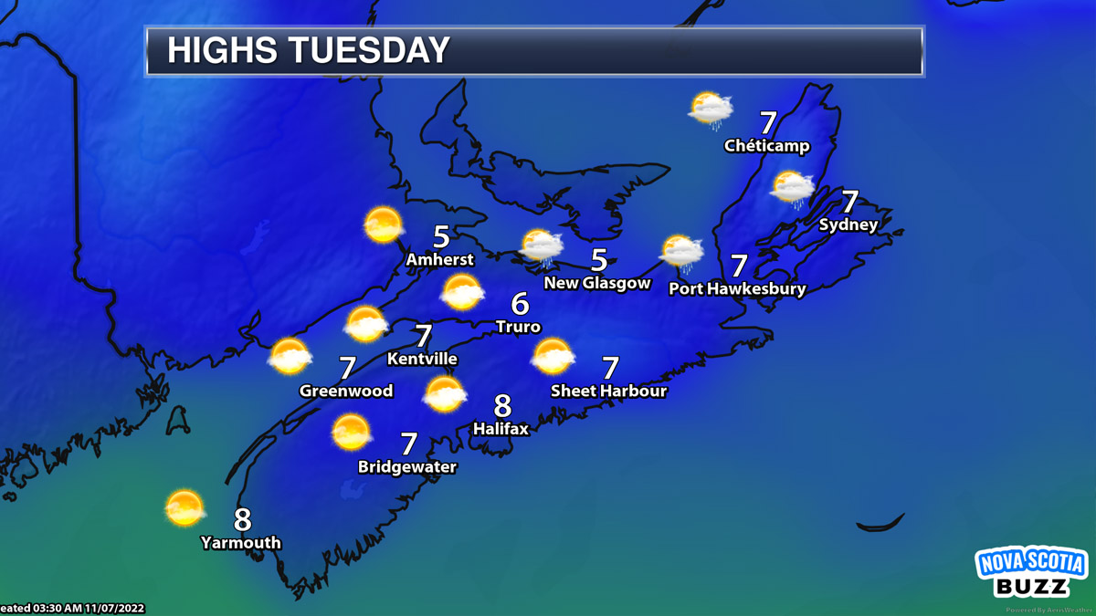 On Tuesday, temperatures are forecast to plummet across Nova Scotia as the first preview of cooler winter weather moves in to the region.
